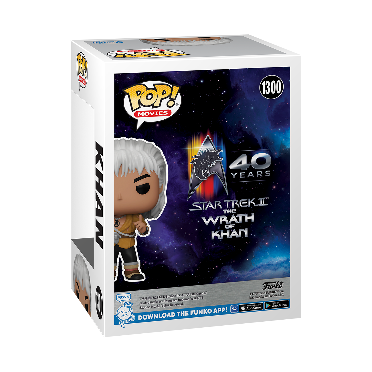 Commemorate 40 years since the release of Star Trek II: The Wrath of Khan with this Star Trek Shop exclusive edition Funko!  This STS exclusive design was chosen by fans across the globe in the first-ever Funko Exclusive Worldwide Fan Vote!  The figure features incredible details such as Khan's iconic pendant, his black gauntlet glove, and his warrior belt, and comes in a handsome display box complete with the custom Star Trek Shop 40th Anniversary Exclusive sticker of authenticity.  This official 40th Anniversary Funko POP! is available in strictly-limited quantities so don't miss out!