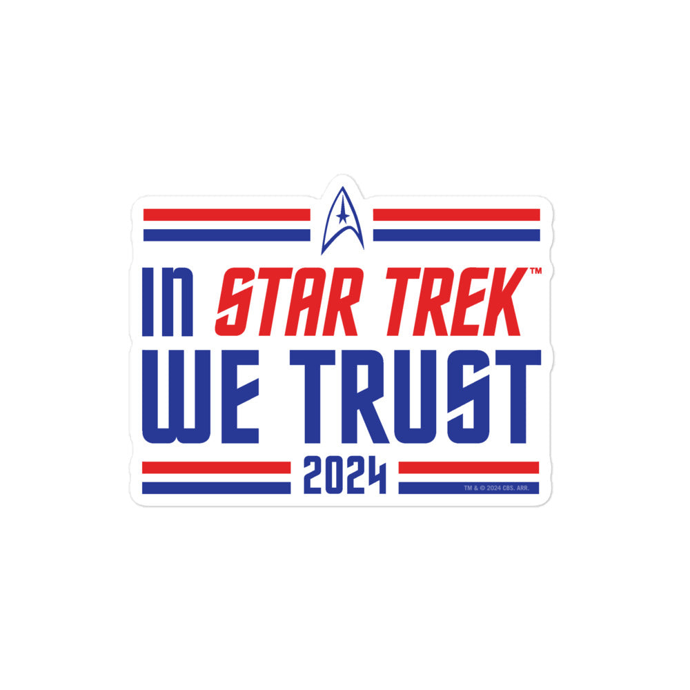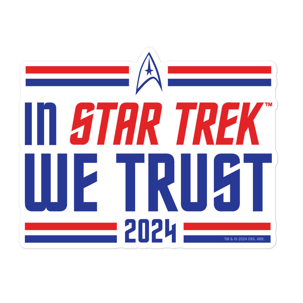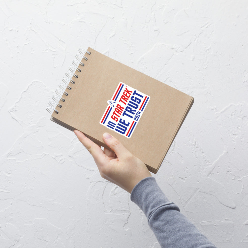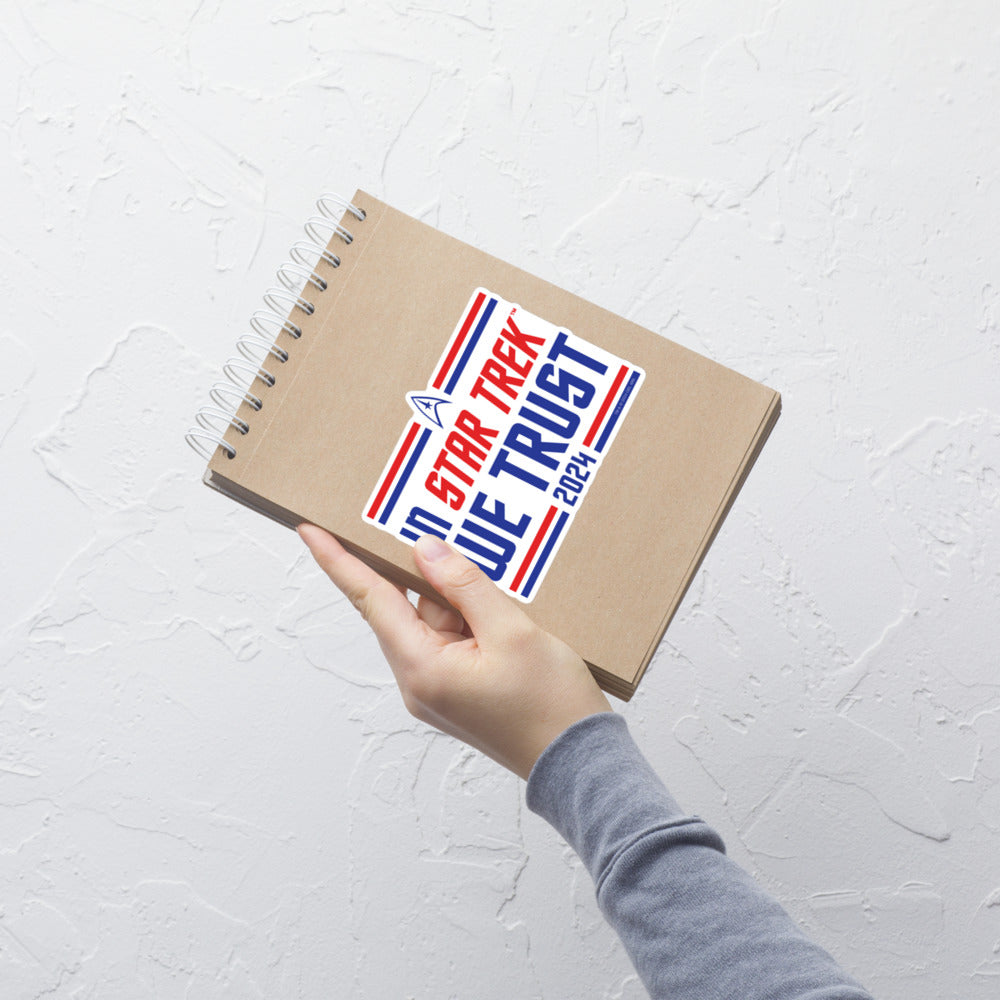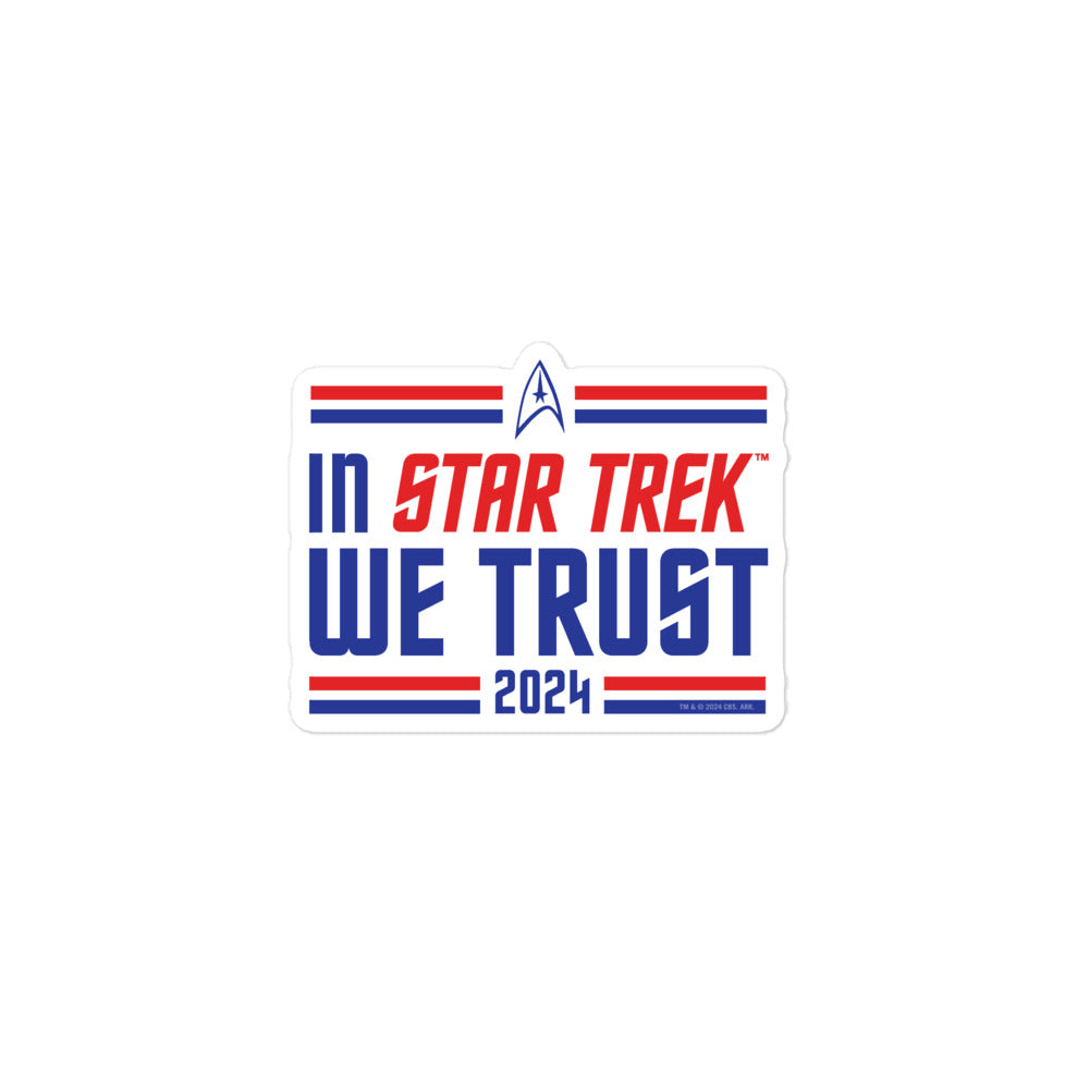 Add a touch of Starfleet wisdom to your belongings with the Star Trek "In Star Trek We Trust" Sticker. This high-quality vinyl sticker, featuring the iconic phrase, is ideal for customizing your laptop, water bottle, or notebook. Built to last and easy to apply, it's a meaningful way to express your belief in the optimism and adventure of the Star Trek universe.