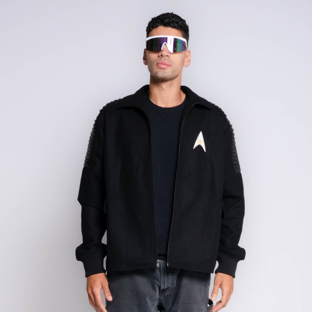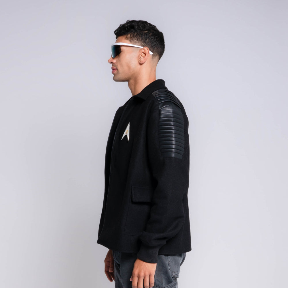Designed for all-day wear, the jacket is lined with a soft interior that keeps you comfortable whether you're exploring new worlds or attending a Star Trek convention. Made from a high-quality wool/polyester blend, it offers both durability and warmth, while vegan leather accents add a sophisticated touch.