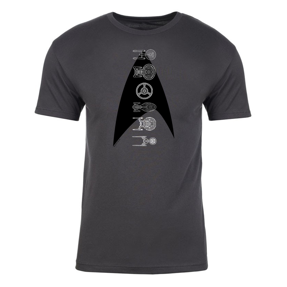 Wearing this Star Trek Ships of the Line T-Shirt is the most logical fashion choice you can make. Featuring the U.S.S. Enterprise NCC-1701, NCC-1701-D, Deep Space 9, Voyager, and the Star Trek Delta, this tee will let everyone know that you are the biggest Star Trek fan.