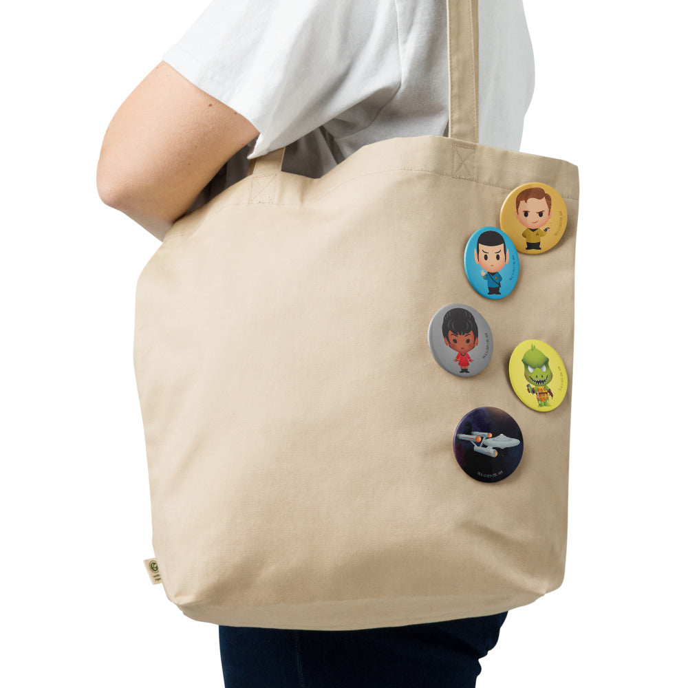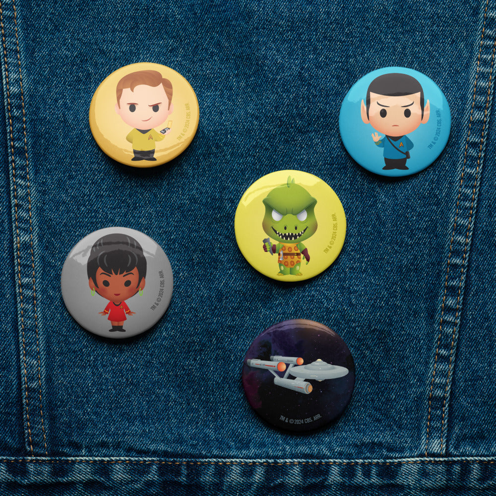 Presenting the Star Trek: The Original Series Chibi Pin Set—a charming collection of miniature pins featuring the beloved crew of the U.S.S. Enterprise in delightful chibi form.
